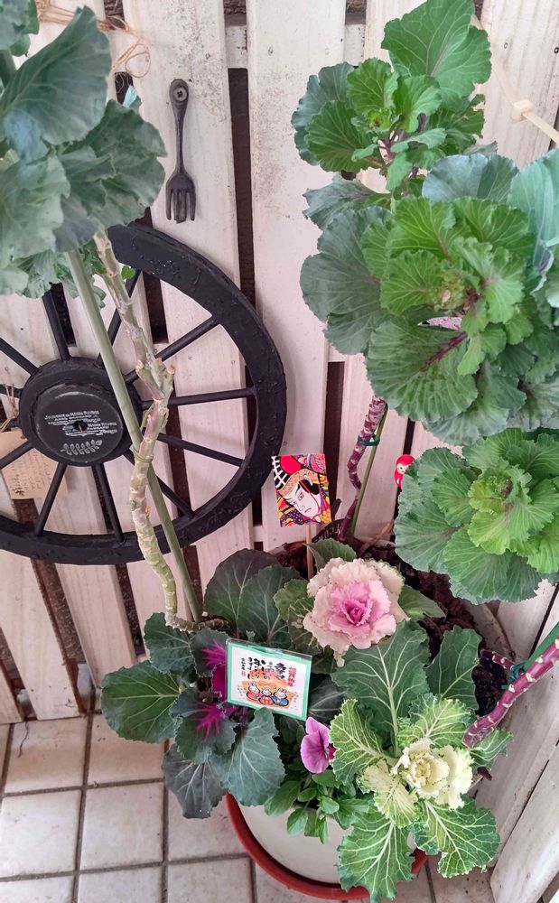 花友さんに頂いた葉牡丹で作る寄せ植え。3つ目は、3年目の葉牡丹(一昨年のリングバスケットの苗を解体)の下に、今年の葉牡丹を植えました。茎は紫と白。太くて一応クネクネさせてます😁高さは85cmスノコフェンスから顔出してます。1m弱。