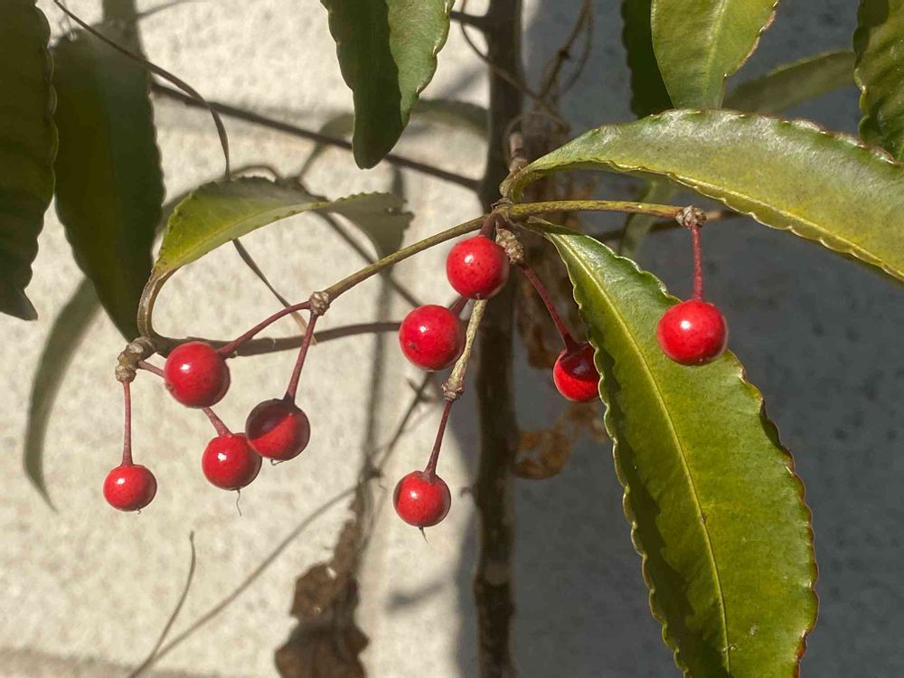 埼玉県川越市で見つけた万両(マンリョウ)です。ちょっとまばらですが、お日様に当たって、ピカピカしていました