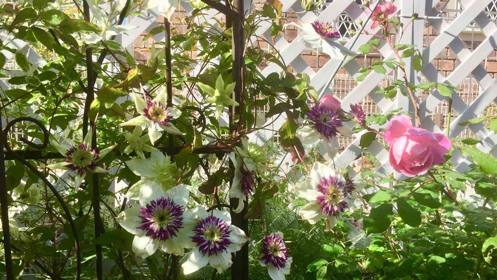 クレマチス ビエネッタと白万重と薔薇アランティッチマーシュ✨✨