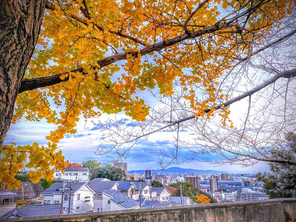 銀杏の葉っぱと空や可愛い🏡街並みのカラーが美しいです