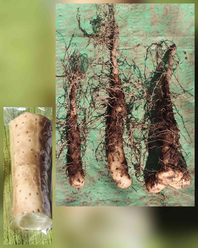 スーパーで買ったパック包装の長芋 剥いた皮をビニールポットに植えて伸びてきた苗をプランターで栽培。地上部が枯れたので掘り出してみると小さな長芋ができていました。(約20cm) 来年春、これを種芋にしてプランター栽培してみる予定です。