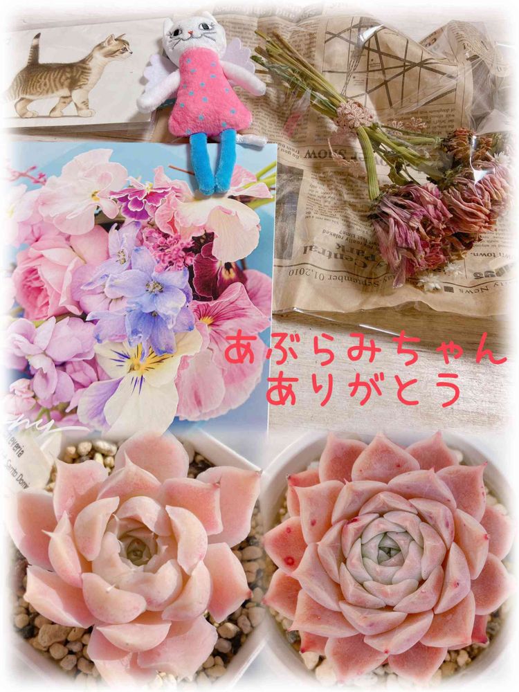 猫ちゃんポストカード、猫ちゃんマスコット、お花のカレンダー、ジニアカクタスのドライフラワー、写真にはないですが薔薇の挿し木苗3鉢(しかも1つは6号鉢位に植えられていてびっくり)とお花の種とクッキー❣️