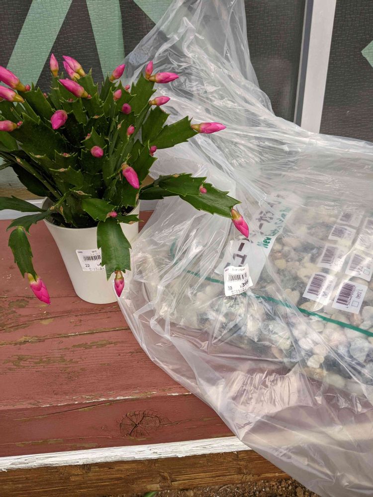ジャコバサボテン。庭砂利を一袋、🧱レンガ2個。趣味の園芸1冊、12月号!後に食料品😋🥳