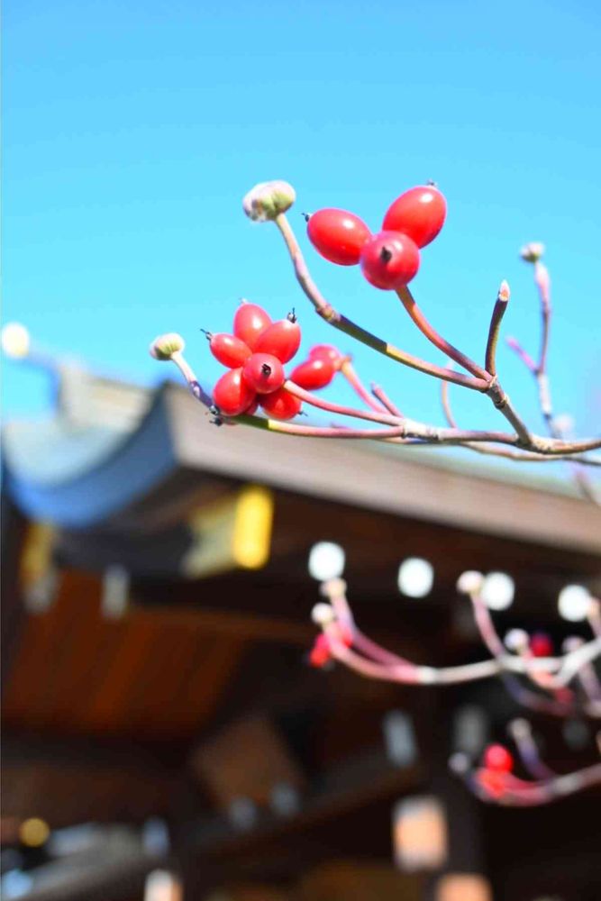 神社のハナミズキの実、真っ赤でツヤツヤして可愛いです🍒