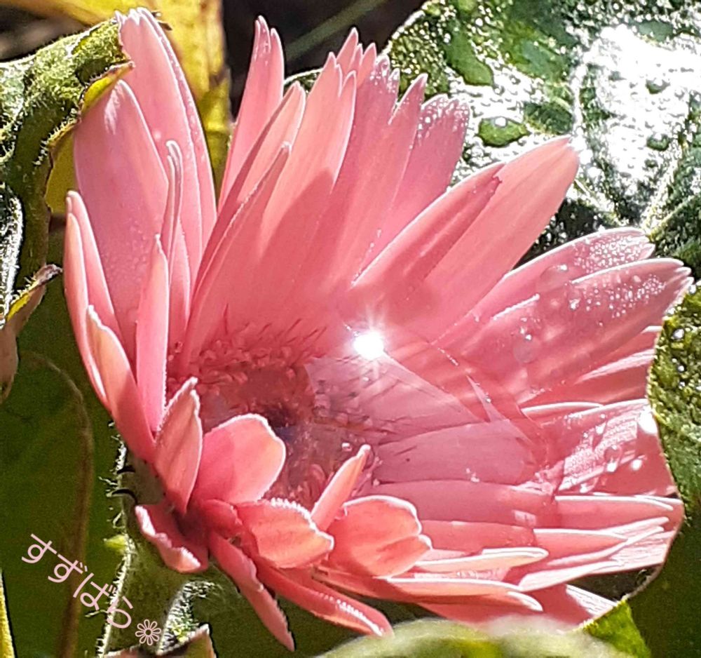 素敵なサーモンピンク(?)のガーベラに水溜り?!…そこに朝日が写ってるの??…凄い凄い!…きれい〜🤭✨✨✨