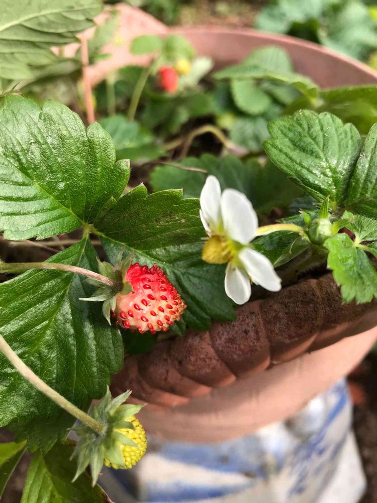 実は普通のイチゴちゃんより小さめなのかなぁ🤔お味は甘いのかなぁ😋鉢植えだと見ても楽しめていいですよね😍
