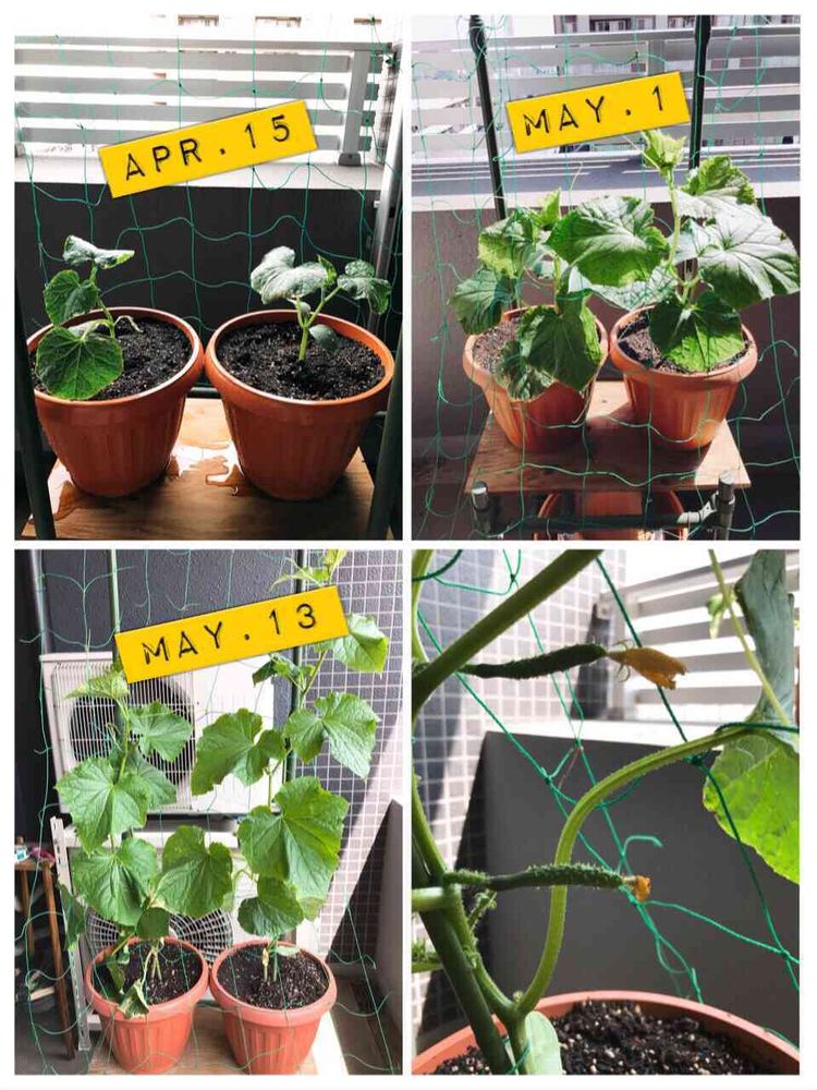 4月15日に植え付けしたキュウリさん。2週間ごとの写真を見ると着々と成長中。