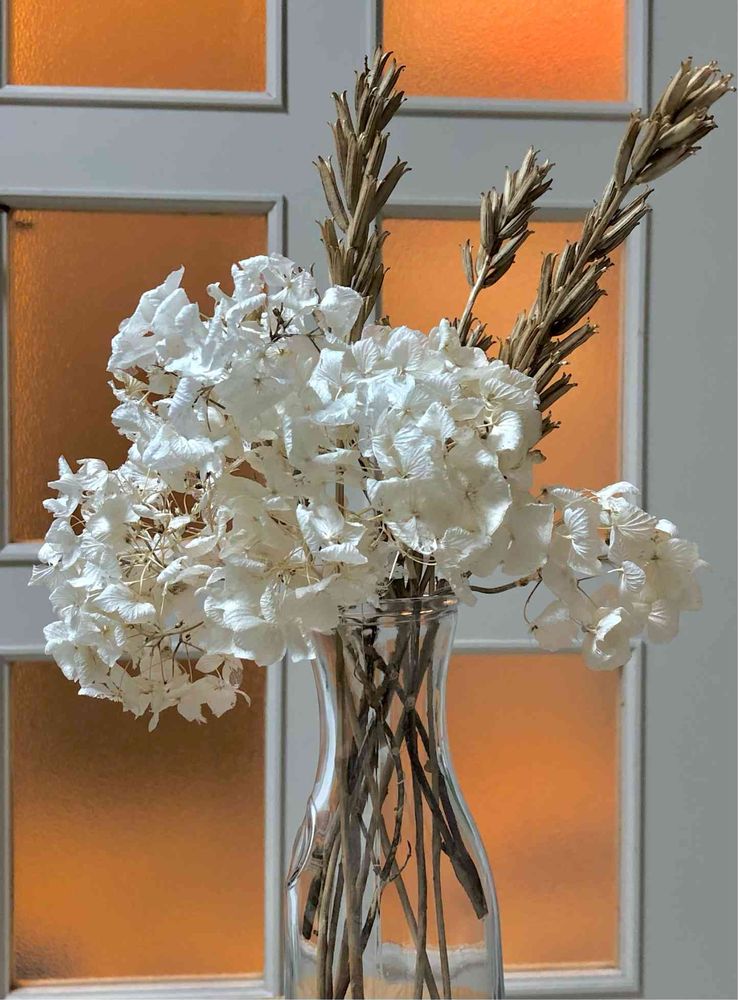 主人の実家のご近所さんが、枯れた紫陽花を切り取られていたので数本いただき漂白しました✨ 茶色い植物と一緒に飾ると、シックな感じ😊💓