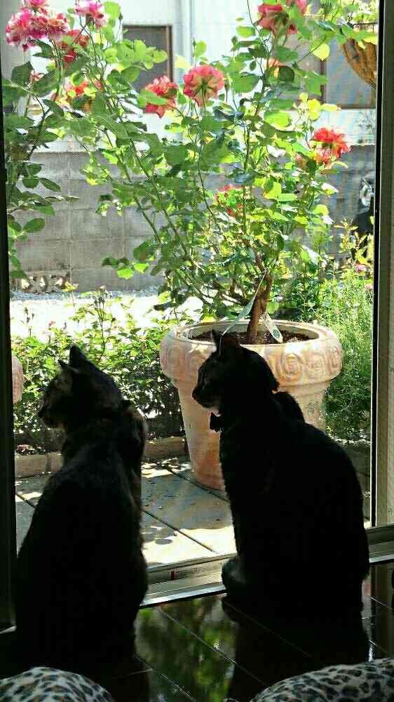 tantanちゃんの可愛いお庭のお花たちと 男子ニャンズの切ないシルエットがとってもステキなpicだね💕