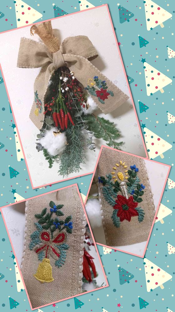 刺繍したリボン🎀 、この時期にしか使えないのですが、少し大人っぽい図案で気にいってます。