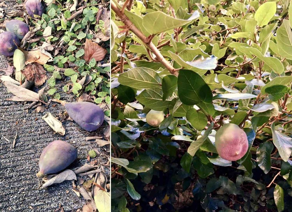 足元を見ればゴロゴロとイチヂクのような果実が転がっています。崖を見上げると実が。美味しそう🤤。コンクリート壁の緑化のために植えられたオオイタビの実のようです。