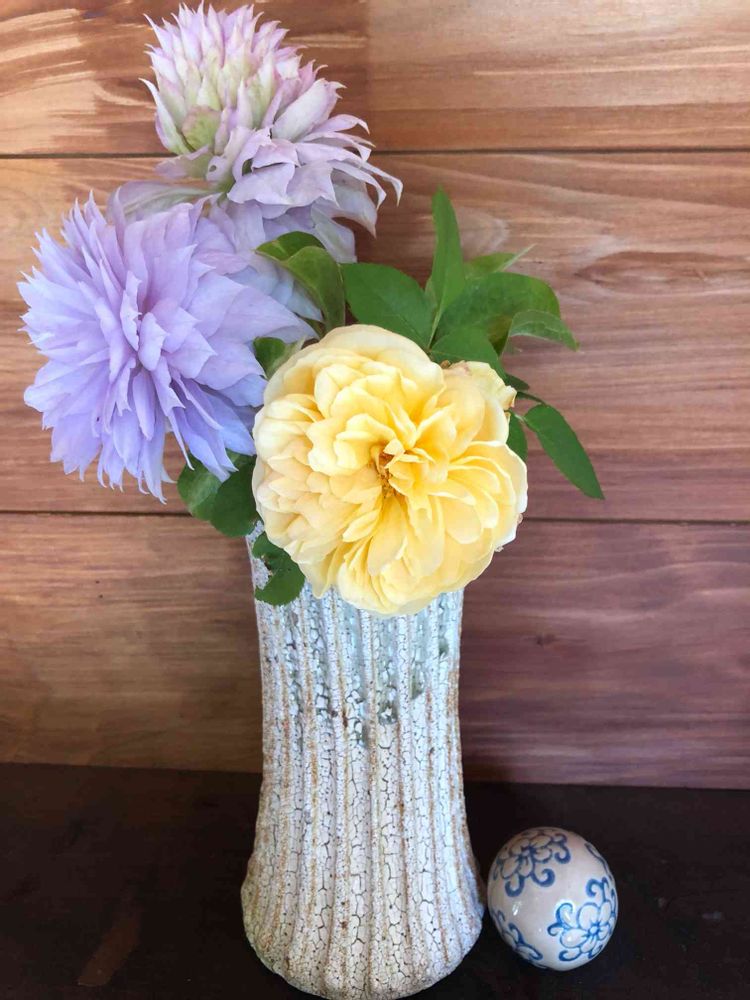 庭で咲いたクレマチス ベル オブ ウォーキングと薔薇のティージング ジョージアを玄関に飾りました。