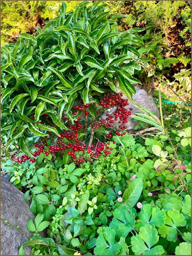 ナンテンの実は上に飛び出してある⚪︎マンリョウは葉の下側に実がある⚪︎センリョウは葉の上に実があるって事は‥艶々実の万両☀︎*周辺の葉の種類がいっぱい♥︎ゲンノショウコ、ヒメツルソバ、ハツユキカズラ❅❅❅❅❅❅🐈🤍♩