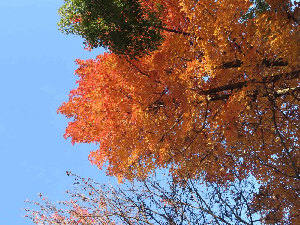 昼過ぎの陽射しに照らされ、「モミジバフウ」の紅葉が輝いていました。パチリ