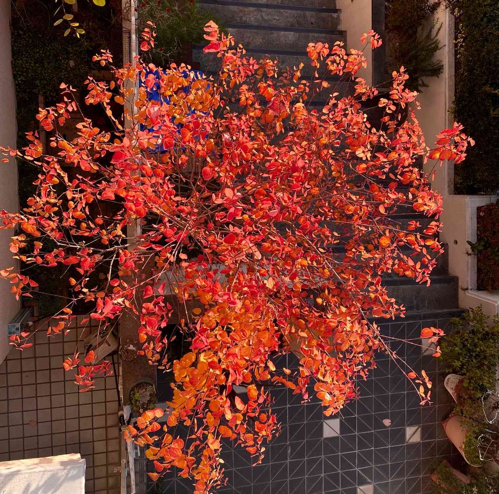 夕日を浴びた紅葉真っ盛り🍁🍁🍁のお姿をベランダから身を乗り出して真上から見てみました😊