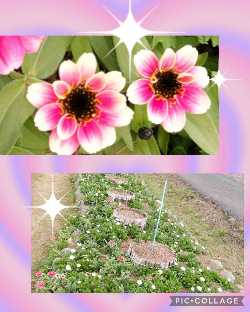 花壇の花🌼は、これは、百日草と言います☺️同じ所から、ピンク色だったり、オレンジ色ぽいのも、色々な色の花🌼💗が混ざってます☺️ノ―スポールは、白い花で、マ―ガレットを小さくしたみたいな花🤍🌿です一株から沢山咲くので、空間埋めるには、良いですが、元気過ぎます。今見てくれた花壇の中を🤍く小さく咲き、葉っぱが緑でびっしり咲いてるのが、ノ―スポールです♥。