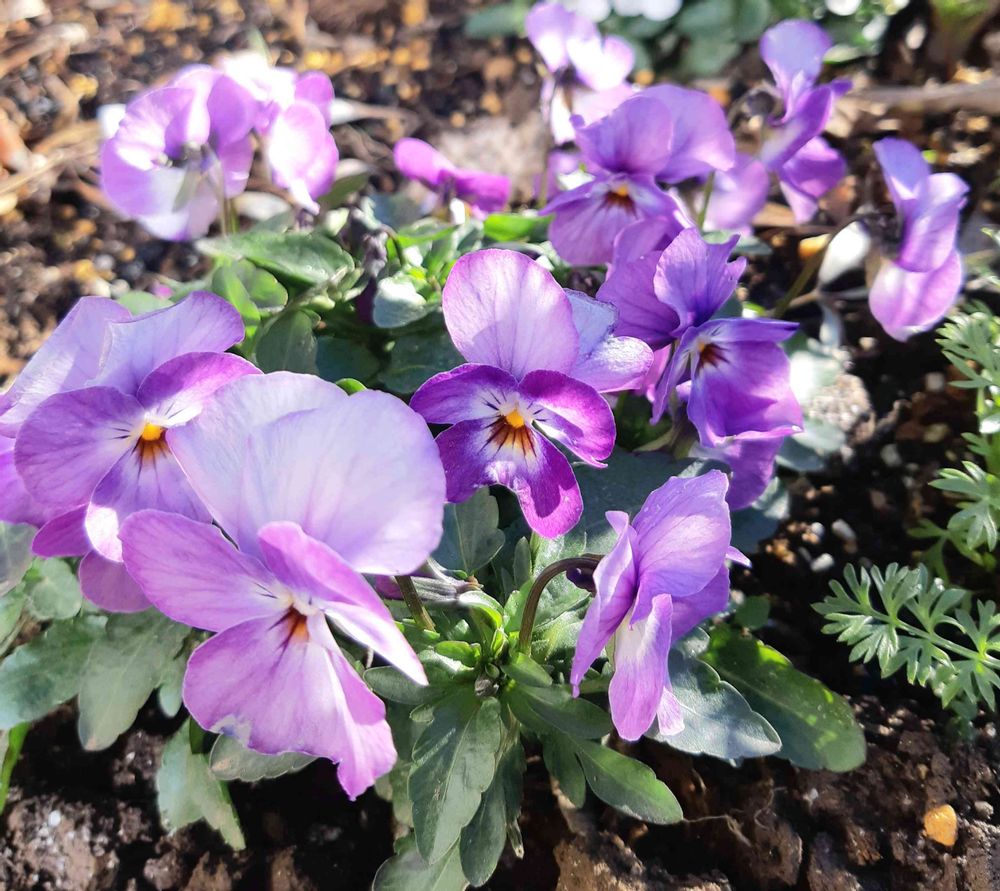 冷え込みで朝はシナシナになっている庭のビオラたち、しばらく陽が当たるとシャッキリ🌿✨