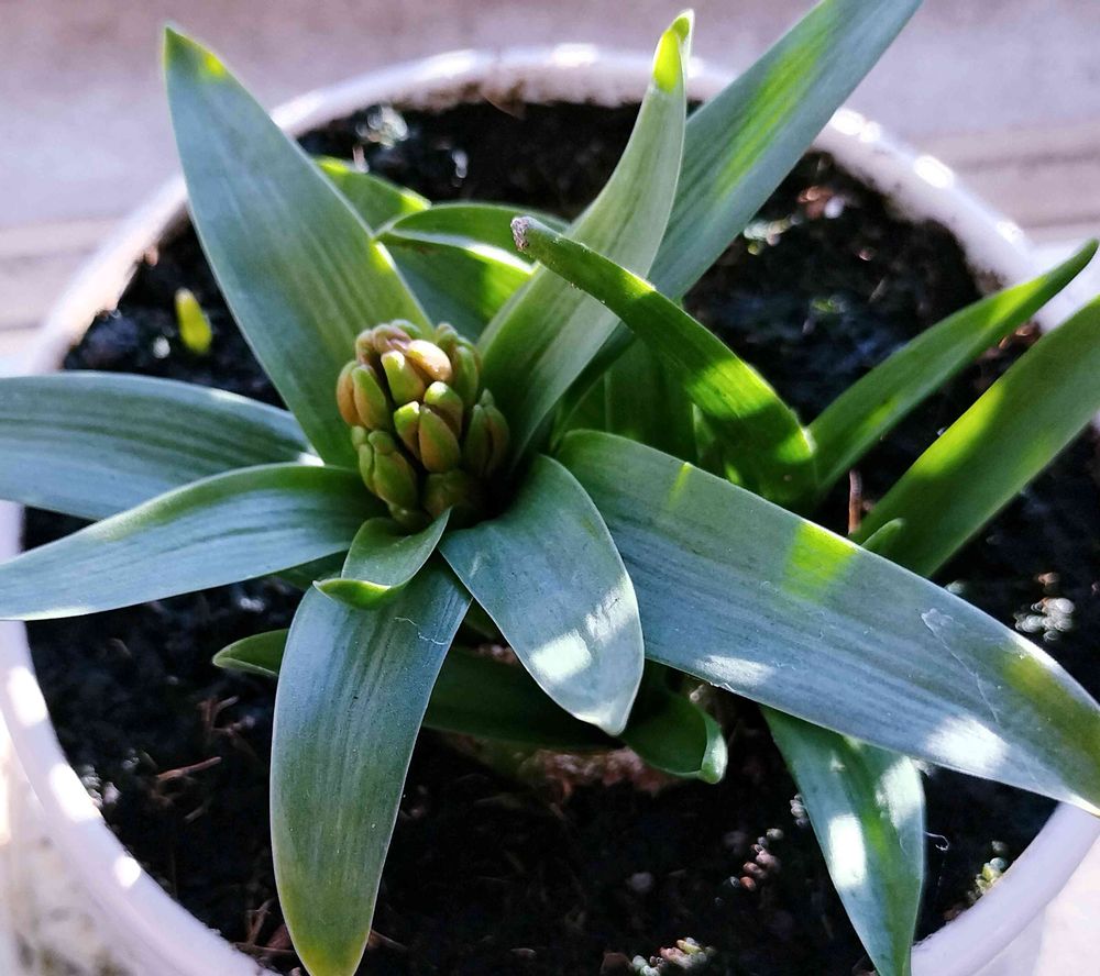 去年のヒヤシンスの球根から早々出て来た蕾のアップです。