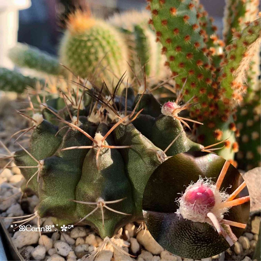 2年以上育てている🌵ちゃん寄せ植えの鉢にいる、ギムノカリキウムなのかなぁ?何かピンク色のものが出来ていました😮
