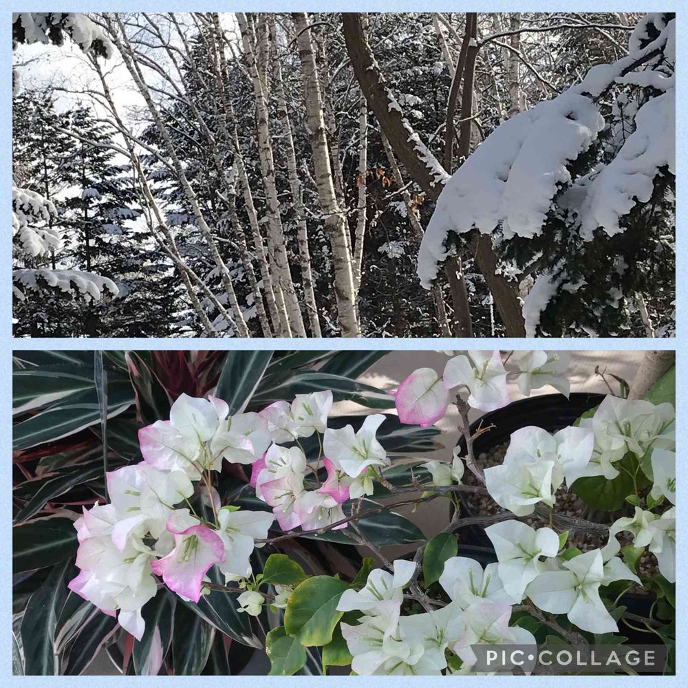2階の温室に白とピンクのブーゲンビリアが咲いていました。