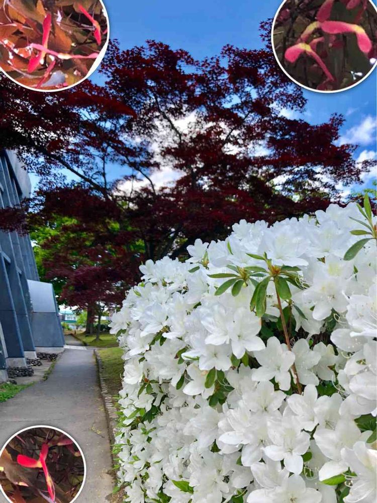 白ツツジ祭り開催中の、白ツツジ公園から❣️真っ白な中にモミジ🍁