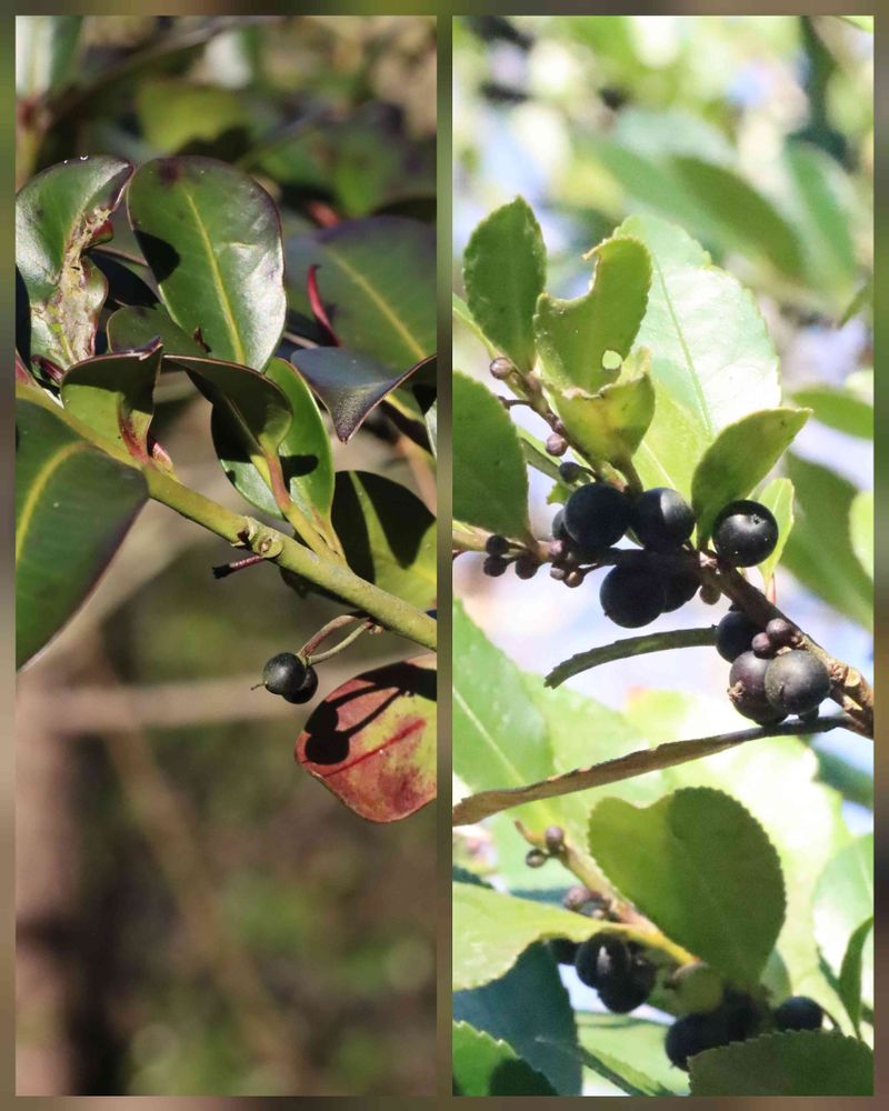 ⇨ ヒサカキ(姫榊・非榊) 関東以北ではサカキとして代用 葉が小さく、鋸歯(ぎざぎざ)がある 小さな実のように見えるのは早春に咲く花の蕾