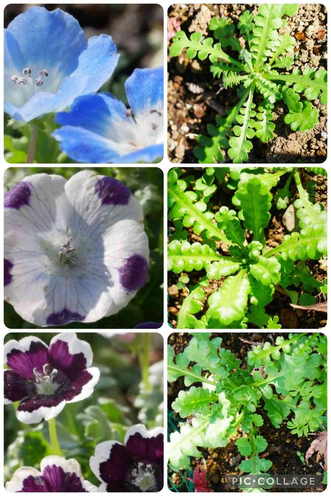 左側は去年咲いたブルーフラワーガーデンのミックスの種から育ったネモフィラ達。上からインシグニスブルー、マクラータ、ペニーブラックです。