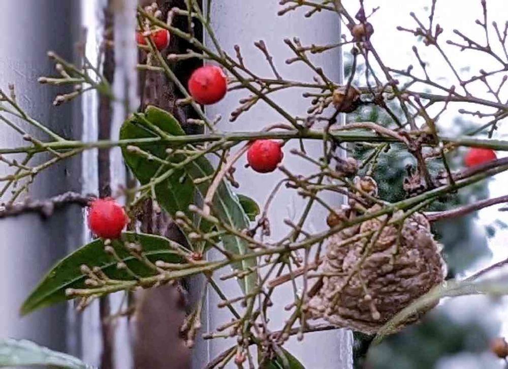 前投稿の赤実南天にはカマキリのスポンジ状の卵嚢(卵鞘)が付いていました この中には200〜300個の卵があって 冬の寒さから守られてそれだけの数の子供が春に孵化して来るそうですよ