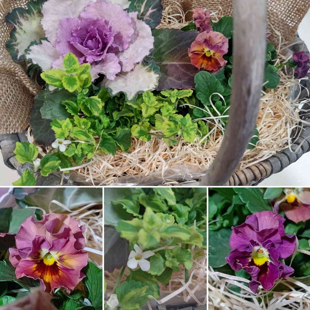 いただいた葉牡丹(タキイの F1つぐみ種蒔きから)で作る寄せ植えの4つめ。アンティークな籠🧺に、ビオラ 華あられと、バコパ ライムバリエガータと一緒に植えました。