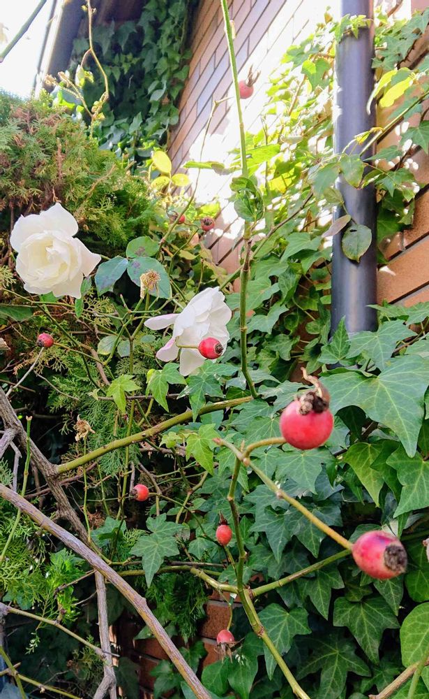 お出かけ先,白い薔薇とローズヒップ,赤い実の投稿画像