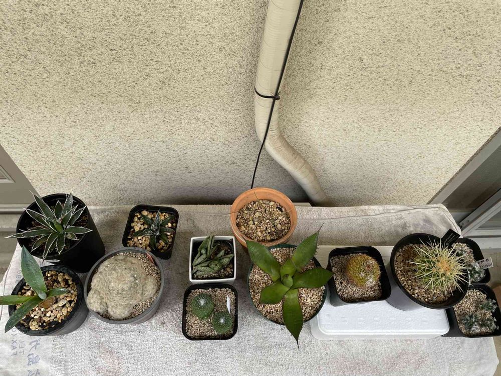 ベランダ越冬組がうっすら雪をかぶってたので、たちまち室外機に雑巾敷いて移動😎