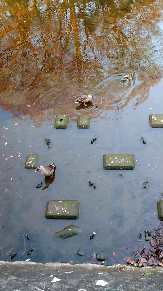 近くの川でカルガモのファミリーに遭遇しました🦆🦆🦆 オレンジ色の水かきあんよがかわいかったです🥰