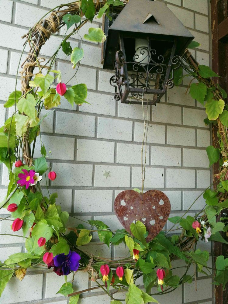 何年か前にモッコウバラの剪定でたくさんある枝をぐるっと丸くして巨大リースを作った。ただ麻紐でしばっただけ。この時期は入り口のチロリアンハットがいつまでも花を咲かせてくれるので伸びた枝をリースに絡めていたらなんだかもう気分はクリスマス☃️