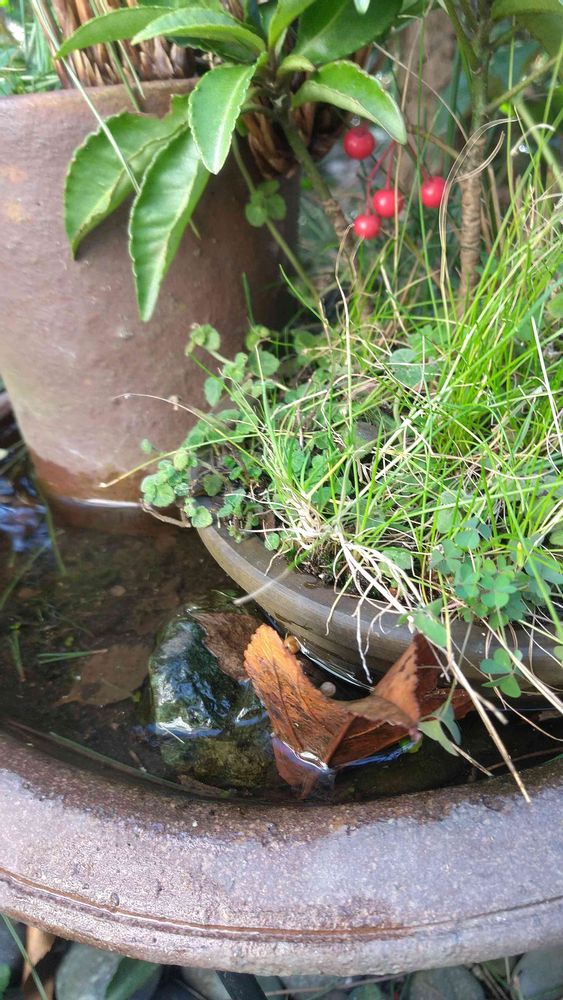 庭の掃除をしていたら、水鉢の中に万両の実が…