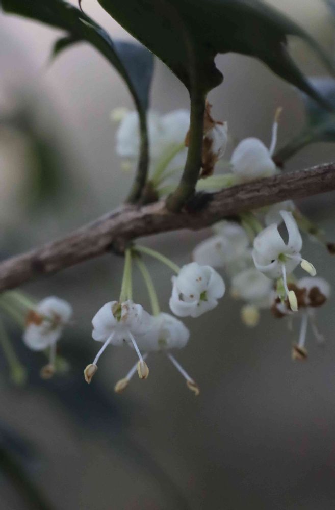 ウォーキングを兼ねて出かけた植物園でヒイラギ(柊)の白い花を見ました。雌雄異株でこれは2本の雄しべが目立つ雄花のようです。