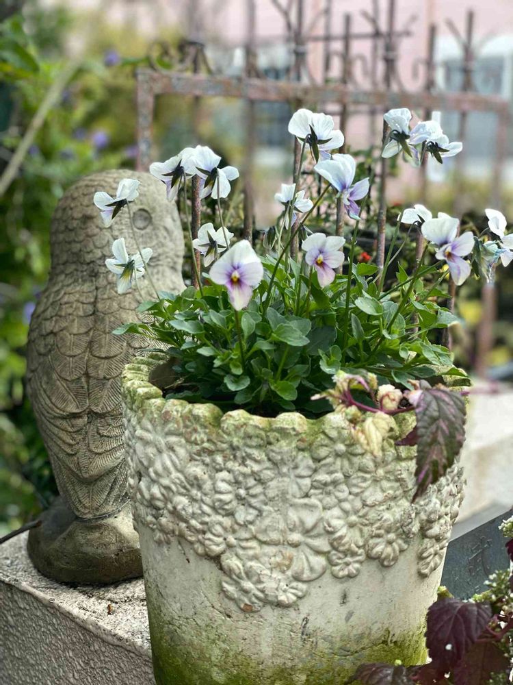 ニュアンスカラーのビオラさん、素敵な鉢が引き立て役🪴