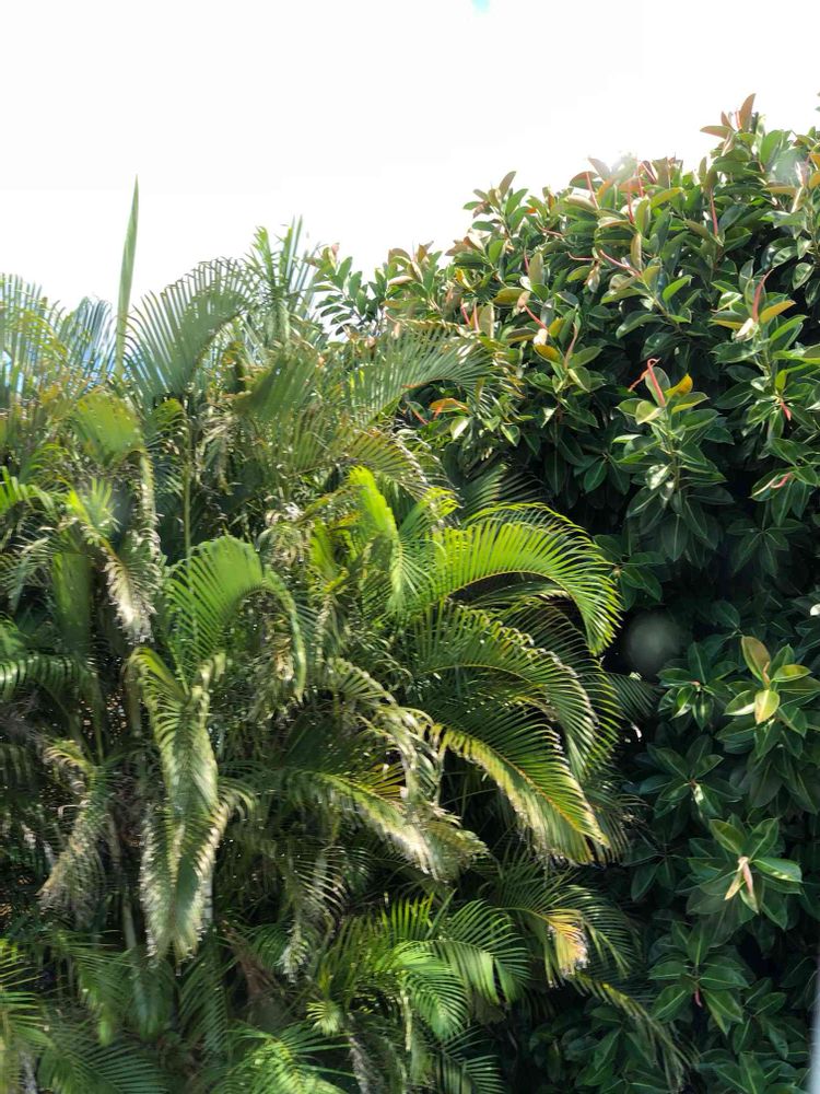 ゴムの木の真ん中辺りのボールみたいな物🟢は何でしょう?ヤシの葉がとてもきれいですね😃💕