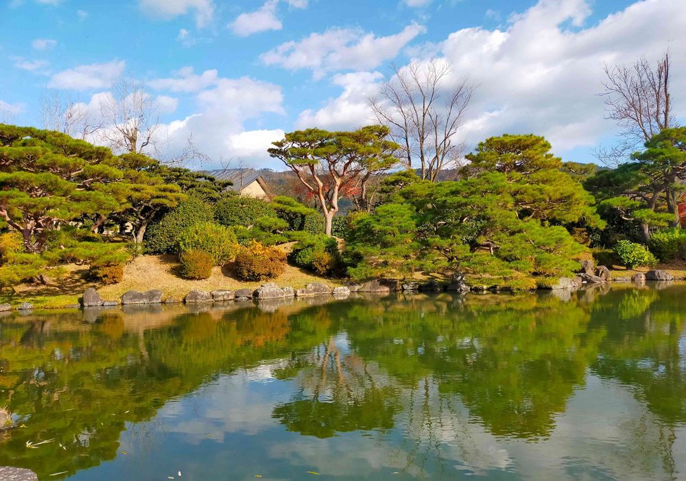 青空と白い雲が緑の庭園を引き立てています。🖼️