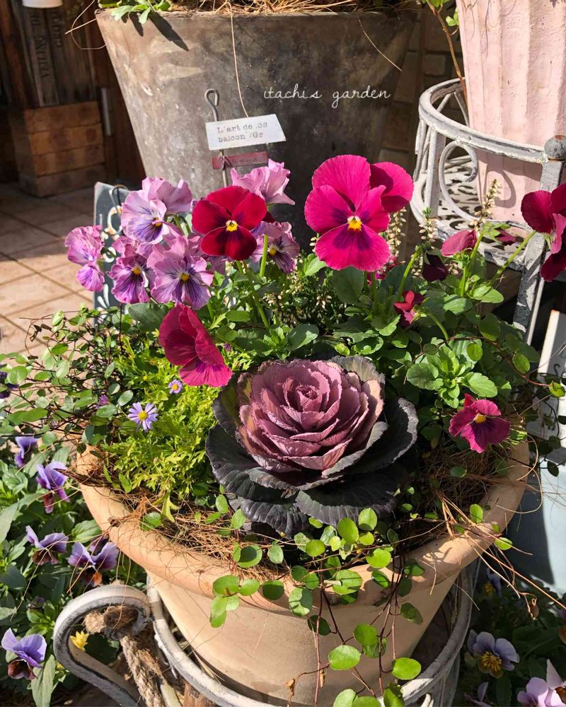 定植して1ヶ月程経った葉牡丹の寄せ植え💕