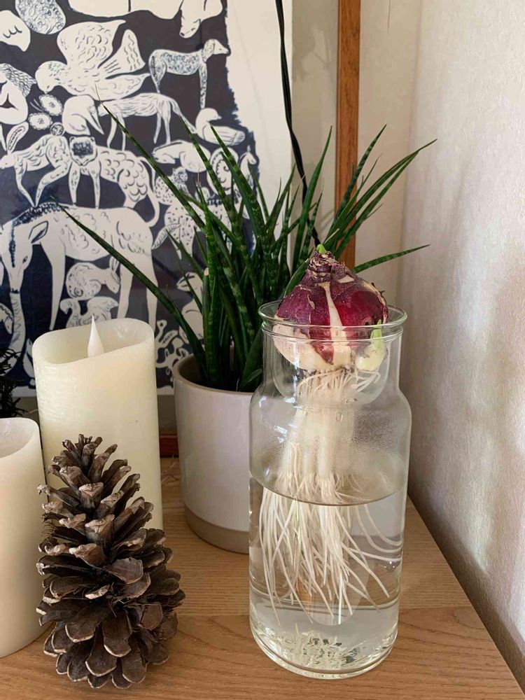 4週間と1日経過しました。黒カビみたいなのがついていて、赤紫の皮がむけてしまいました。水の交換頻度をあげた方がいいかな。芽が出てきてますますかわいい。