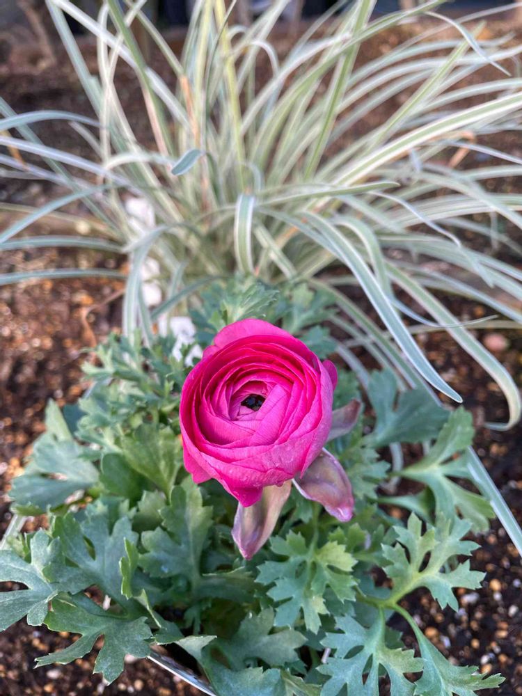 後ろのツルバキアのモジャモジャが気になりつつも、ゆっくり開花するラナンキュラス♪
