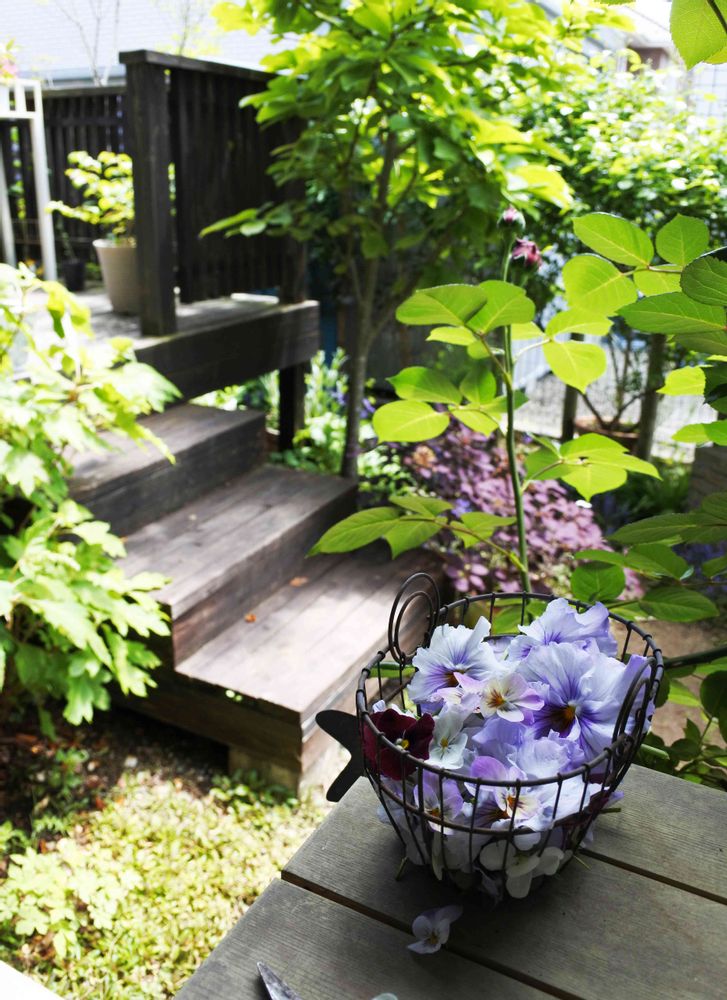 へたり始めたビオラ、パンジーに徐々にさよならし始めました。きれいに咲いてる花をかごに入れて最後のお写真を。