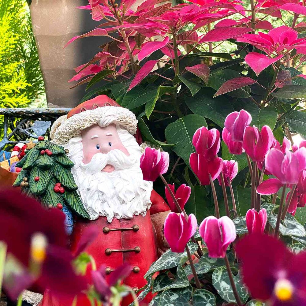 真っ赤なビオラとシクラメン、ポインセチアの中からサンタさんが「ホーホーホー🎅」と顔をのぞかせています🔔