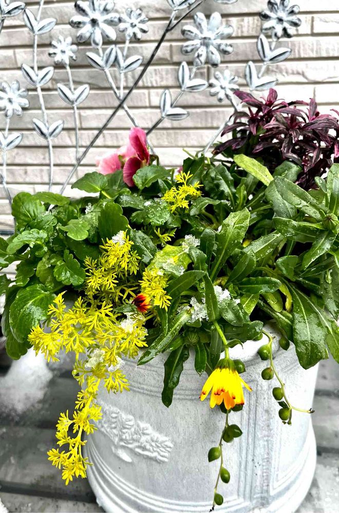 カレンジュラは少し葉の色がおかしくなったのがあったので、もうちょっと雪のかからないところにおきましたが、このバーベナは丈夫そうです🎶