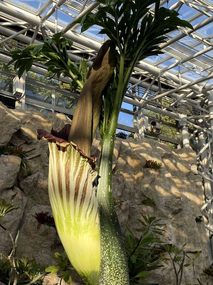 葉と同時に花が咲くのは、世界で二例目。強烈な臭いは夜に最高潮になり、徐々に弱くなるらしい。腐臭から死体花とも言われる。