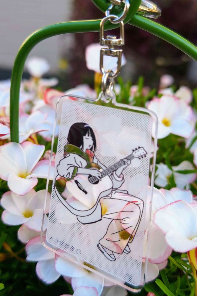 花の上でギターで弾き語り。