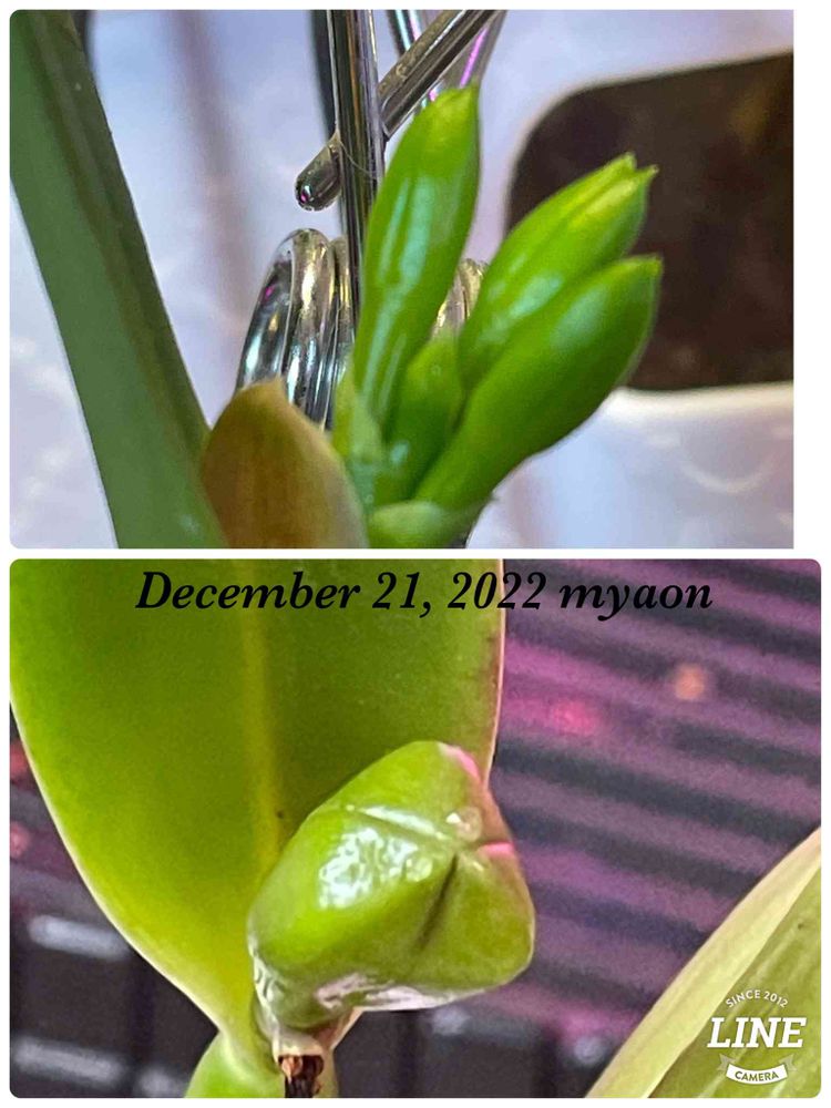 下段 名無しちゃん。ぷっくりした蕾から推測すると抱え咲き?兜咲きのセッコクみたいな咲き方かな〜。