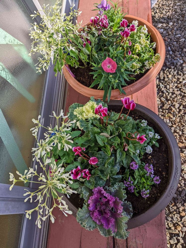 年末には、予定が変更になりそうなので、20日に作った寄植えを、実家と姉の家に持って行きました。びっくりサプライズ😱🌼華やかな寄植えが届いて、驚いていました。葉牡丹を姉に。撫子を実家に。寒さと日照考えての、行き察つとなりました。