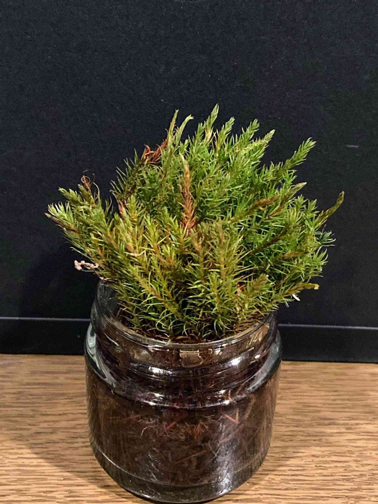 見たことない苔。検索したら、しっぽ苔「かもじごけ」。身近に群生していたのに気づかなかった。一掴み採取して取り敢えずガラス瓶に水栽培。増殖?テラリウム?長いので盆栽の周りには向かないようです。