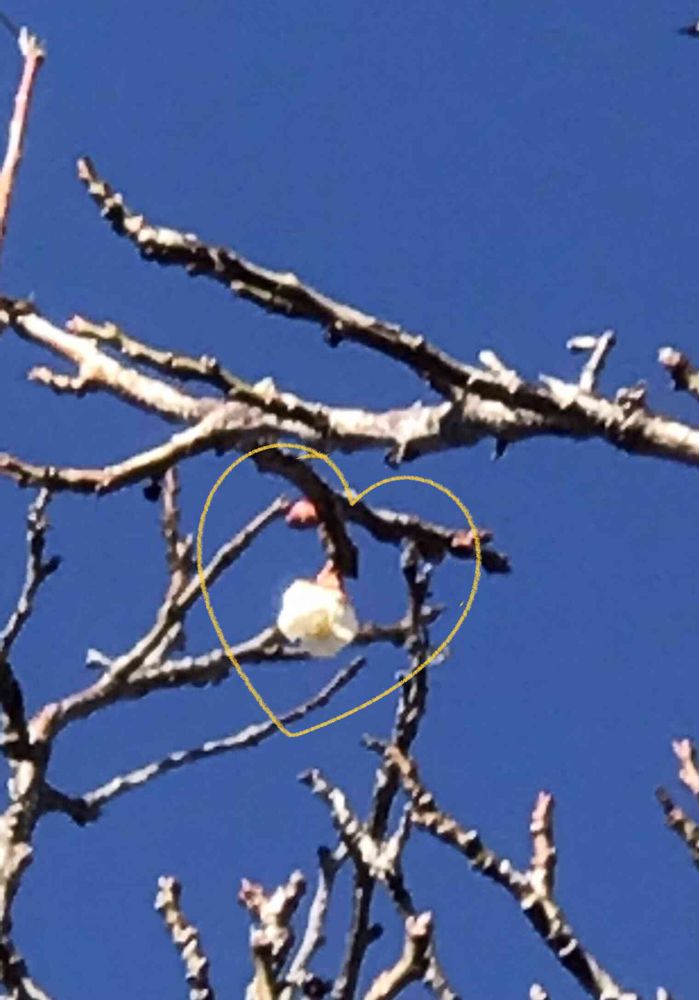 毎年、冬至の頃に、咲き始めるので、梅の木を見上げて、見たら一輪だけ、咲いていました。